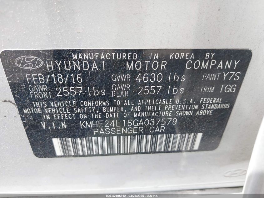 2016 HYUNDAI SONATA - KMHE24L16GA037579, колір - Срібний, 2.0, Гібрид, Передній привід із США