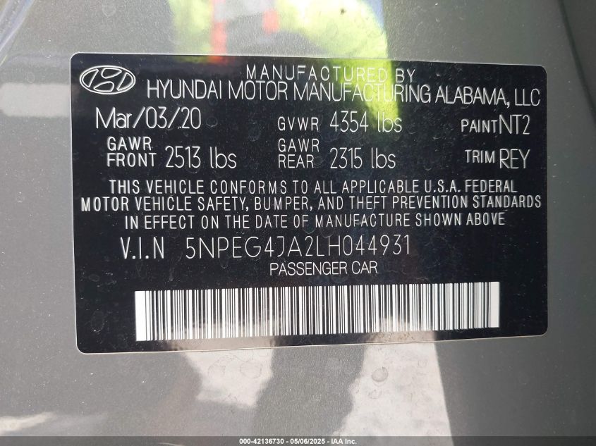 2020 HYUNDAI SONATA - 5NPEG4JA2LH044931, колір - Сірий, 2.5, Бензин, Передній привід із США