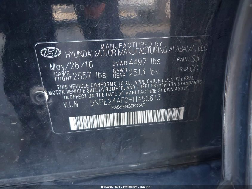 2017 HYUNDAI SONATA - 5NPE24AF0HH450613, колір - Чорний, 2.4, Бензин, Передній привід із США