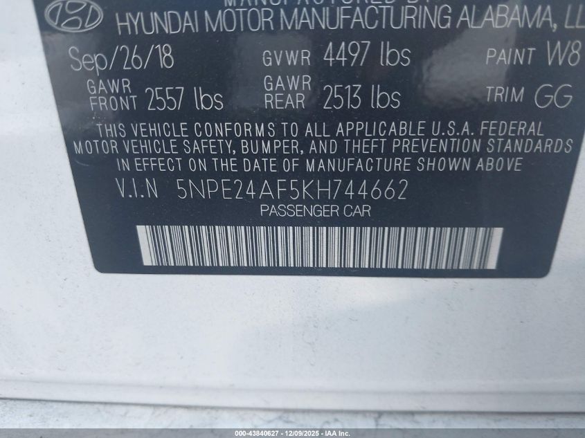 2019 HYUNDAI SONATA - 5NPE24AF5KH744662, колір - Білий, 2.4, Бензин, Передній привід із США