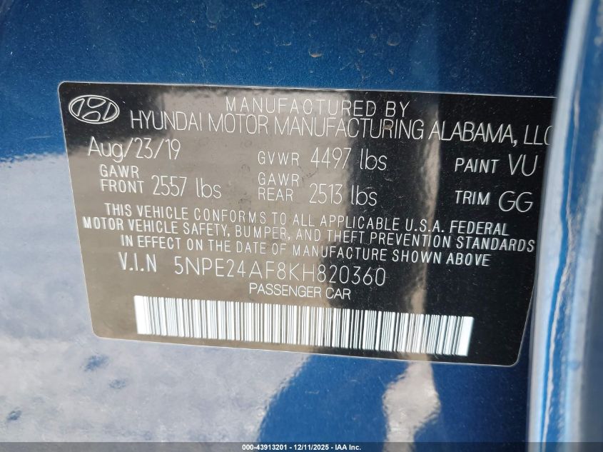 2019 HYUNDAI SONATA - 5NPE24AF8KH820360, колір - Синій, 2.4, Бензин, Передній привід із США