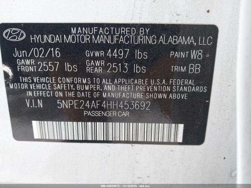 2017 HYUNDAI SONATA - 5NPE24AF4HH453692, колір - Білий, 2.4, Бензин, Передній привід із США