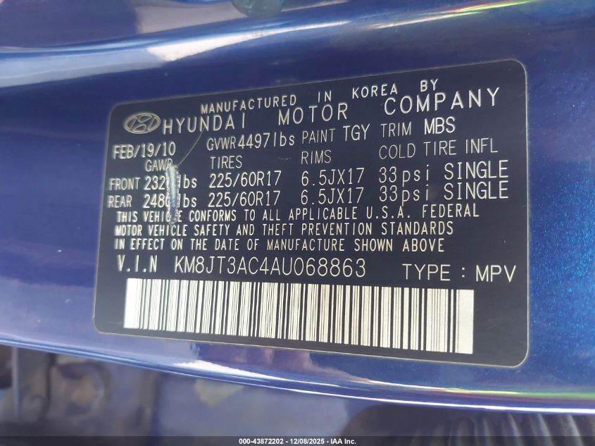 2010 HYUNDAI TUCSON - KM8JT3AC4AU068863, колір - Синій, 2.4, Бензин, Передній привід із США