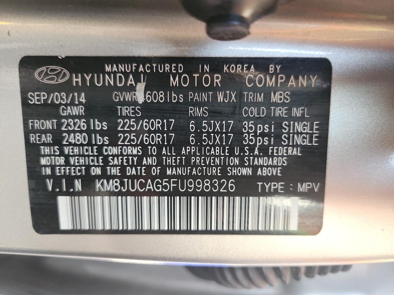 2015 HYUNDAI TUCSON - KM8JUCAG5FU998326, колір - Сірий, 2.4, Бензин, Повний привід із США