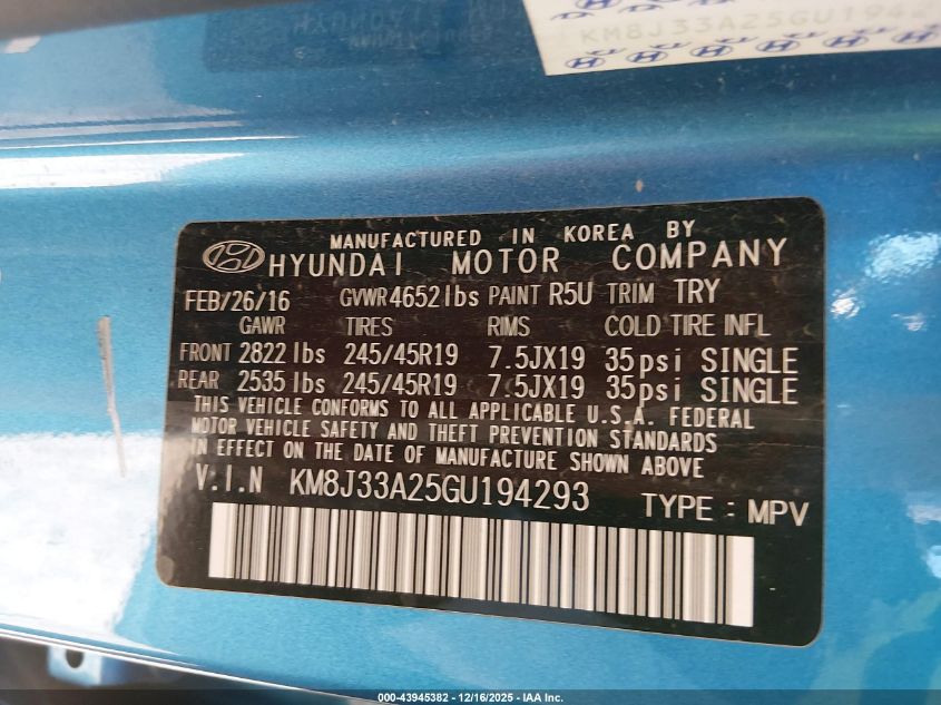 2016 HYUNDAI TUCSON - KM8J33A25GU194293, колір - Синій, 1.6, Бензин, Передній привід із США