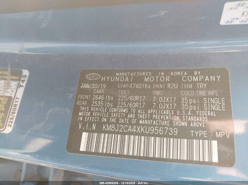 2019 HYUNDAI TUCSON - KM8J2CA4XKU956739, колір - Синій, 2.0, Бензин, Повний привід із США