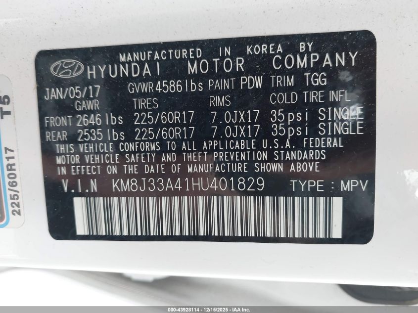 2017 HYUNDAI TUCSON - KM8J33A41HU401829, колір - Білий, 2.0, Бензин, Передній привід із США