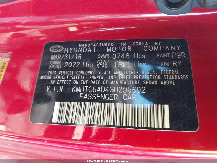 2016 HYUNDAI VELOSTER - KMHTC6AD4GU295692, колір - Червоний, 1.6, Бензин, Передній привід із США