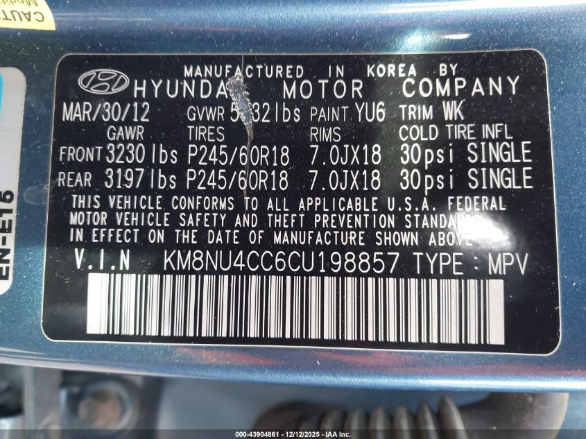 2012 HYUNDAI VERACRUZ - KM8NU4CC6CU198857, колір - Синій, 3.8, Бензин, Передній привід із США