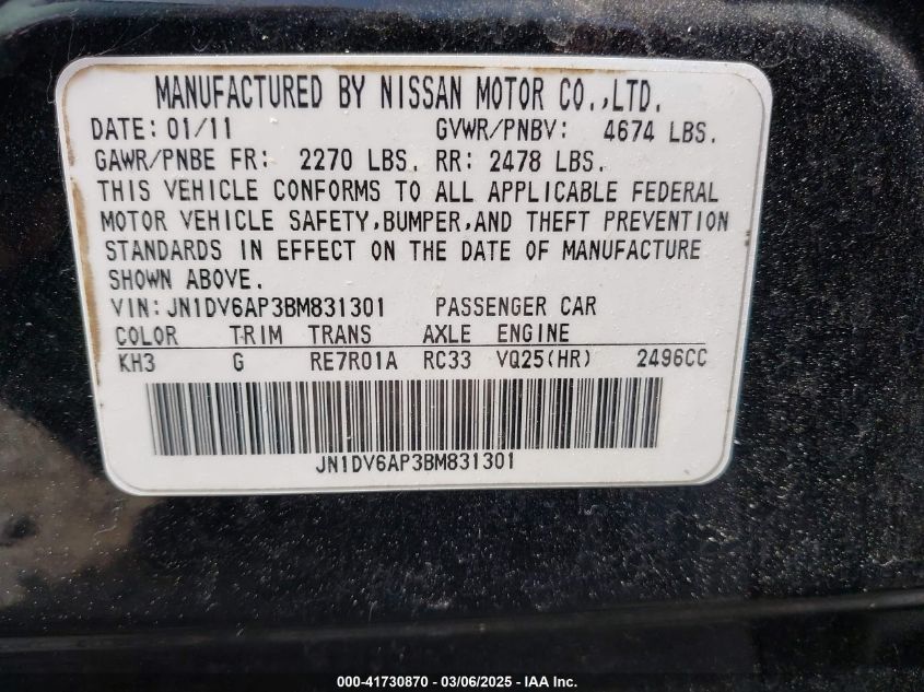 2011 INFINITI G25 - JN1DV6AP3BM831301, колір - Чорний, 2.5, Бензин, Задній привід із США
