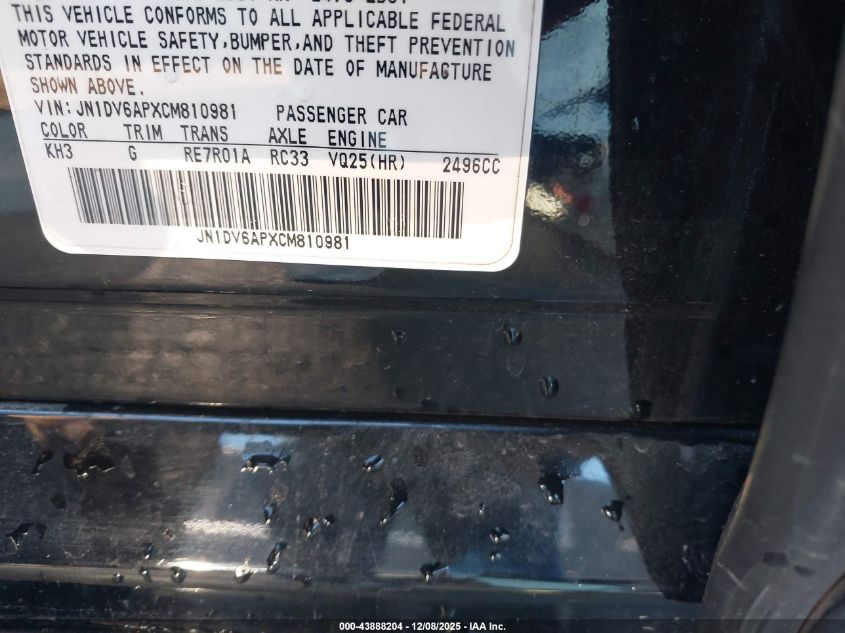 Колір ЧорнийЦиліндри 6Привід Задній привідVIN JN1DV6APXCM810981Стан СтаціонарноУшкодження Ліва сторона