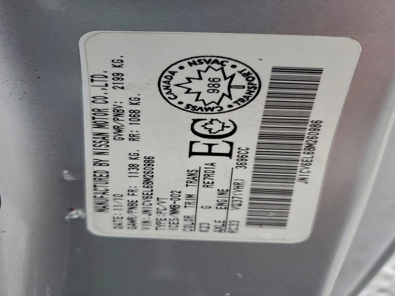 Колір СрібнийЦиліндри 6Привід Повний привідVIN JN1CV6EL6BM260986Стан Заводиться та їде (перевірено)Ушкодження Звичайний зносДата аукціона 2025-12-19
