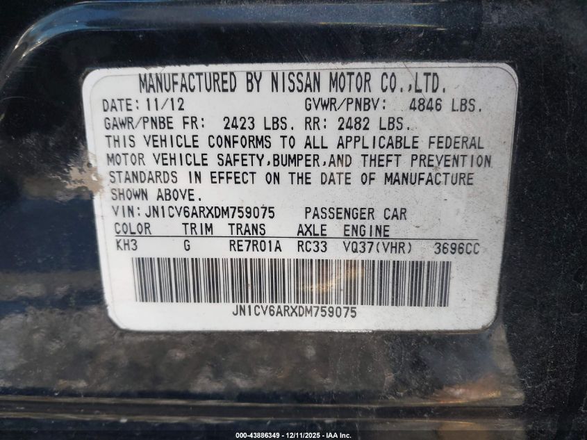 Колір ЧорнийЦиліндри 6Привід Повний привідVIN JN1CV6ARXDM759075Стан СтаціонарноУшкодження Перекидання