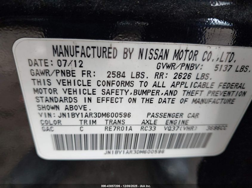 Колір ЧорнийЦиліндри 6Привід Повний привідVIN JN1BY1AR3DM600596Стан СтаціонарноУшкодження Передня і задня Дата аукціона 2025-12-17