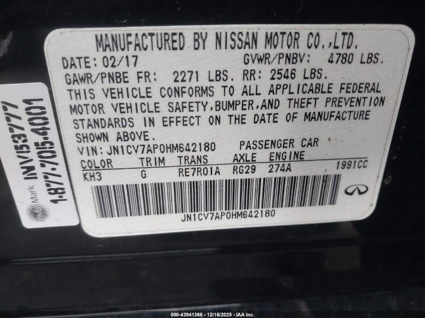 Колір Циліндри 4Привід Задній привідVIN JN1CV7AP0HM642180Стан НевідомоУшкодження Вандалізм