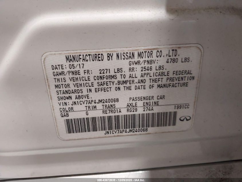 Колір БілийЦиліндри 4Привід Задній привідVIN JN1CV7AP4JM240068Стан Заводиться та їде (перевірено)Ушкодження Ліва сторона