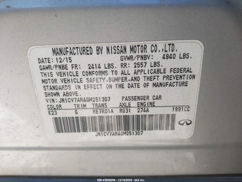 Колір СрібнийЦиліндри 4Привід Повний привідVIN JN1CV7AR4GM251307Стан НевідомоУшкодження Звичайний знос