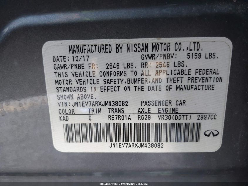 Колір СірийЦиліндри 6Привід Повний привідVIN JN1EV7ARXJM438082Стан СтаціонарноУшкодження Передня або задня