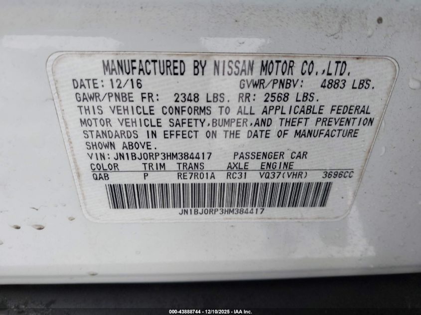 Колір БілийЦиліндри 6VIN JN1BJ0RP3HM384417Стан СтаціонарноУшкодження Передня або задня