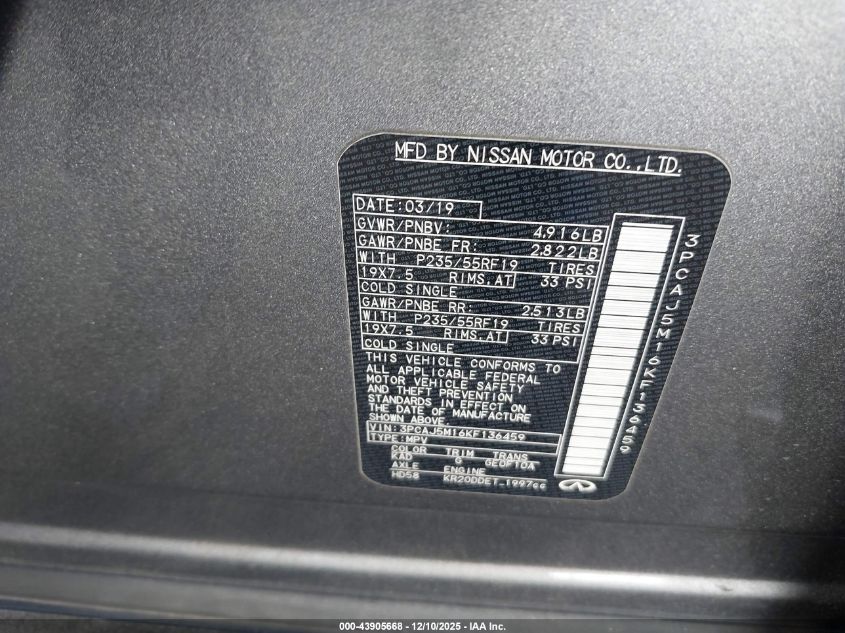 2019 INFINITI QX50 - 3PCAJ5M16KF136459, колір - Сірий, 2.0, Бензин, Передній привід із США