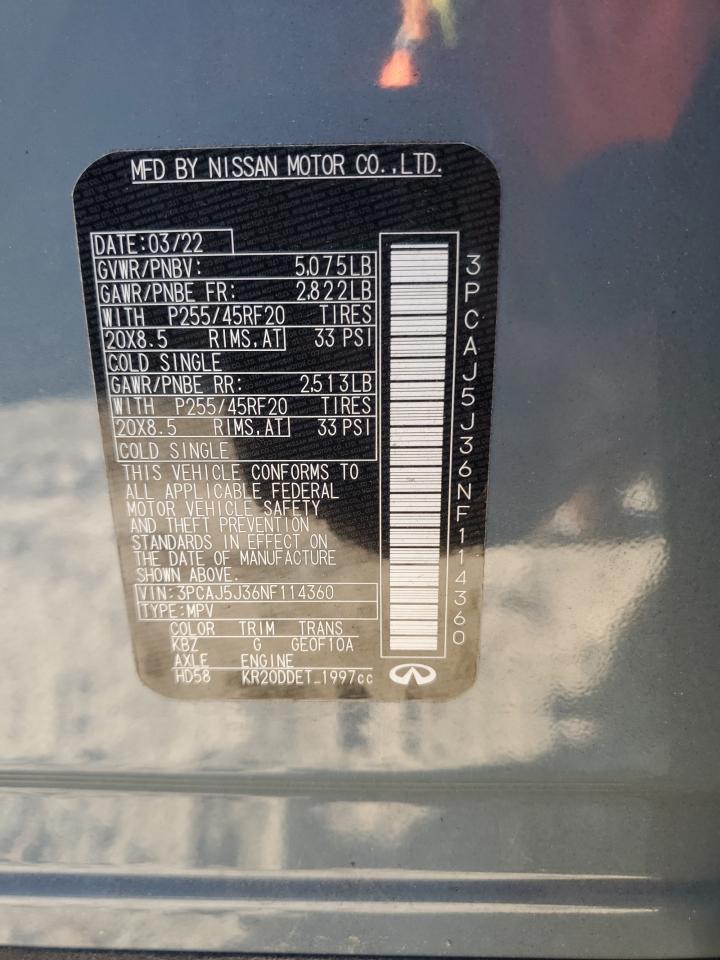 2022 INFINITI QX55 - 3PCAJ5J36NF114360, колір - Сірий, 2.0, Бензин, Повний привід із США