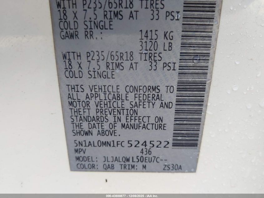 Колір БілийЦиліндри 6Привід Передній привідVIN 5N1AL0MN1FC524522Стан СтаціонарноУшкодження Права сторона