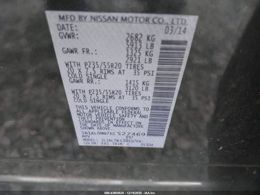 Колір СірийЦиліндри 6Привід Передній привідVIN 5N1AL0MN7EC527469Стан СтаціонарноУшкодження Передня ліва