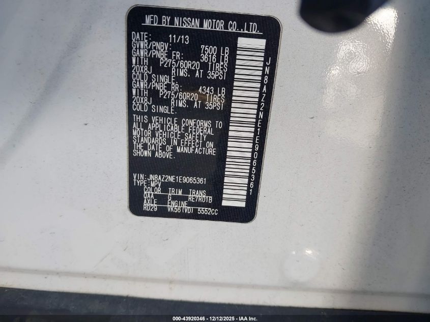Колір БілийЦиліндри 8Привід Повний привідVIN JN8AZ2NE1E9065361Стан СтаціонарноУшкодження Немає