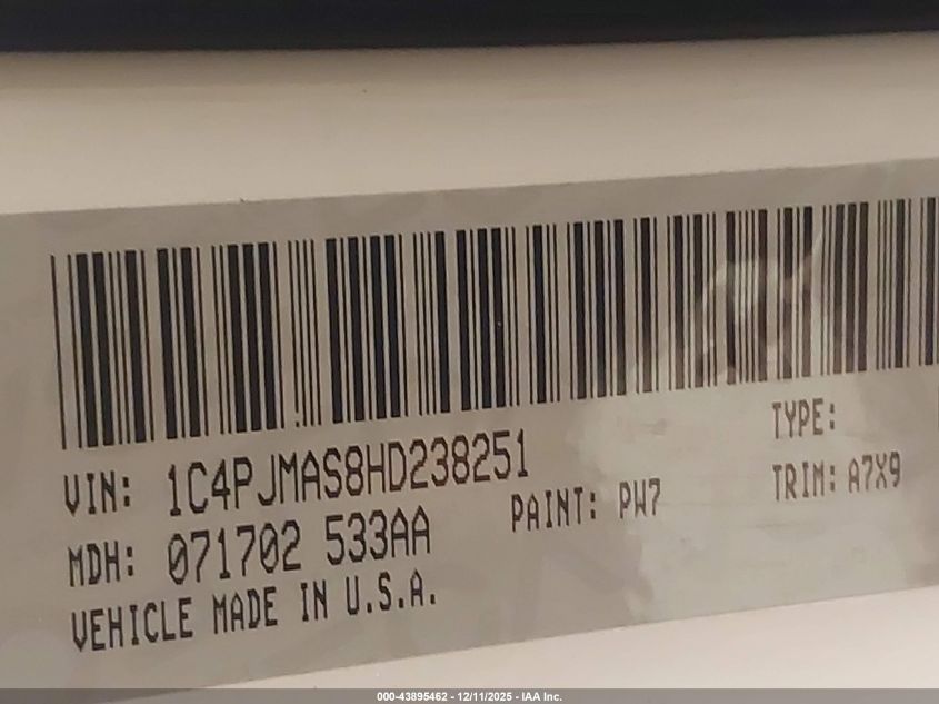 Колір БілийЦиліндри 6Привід Повний привідVIN 1C4PJMAS8HD238251Стан Заводиться та їде (перевірено)Ушкодження Передня або задня