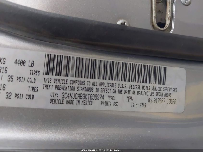 Колір СірийЦиліндри 4Привід Передній привідVIN 3C4NJCAB3KT699974Стан СтаціонарноУшкодження По всьому авто