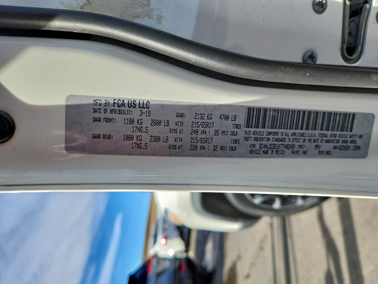2019 JEEP COMPASS - 3C4NJDDB1KT748249, колір - Білий, 2.4, Бензин, 4x4 з переднім приводом із США
