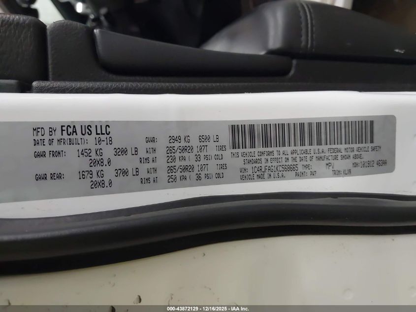 2019 JEEP GRAND CHEROKEE - 1C4RJFAG1KC568665, колір - Білий, 3.6, Бензин, Повний привід із США