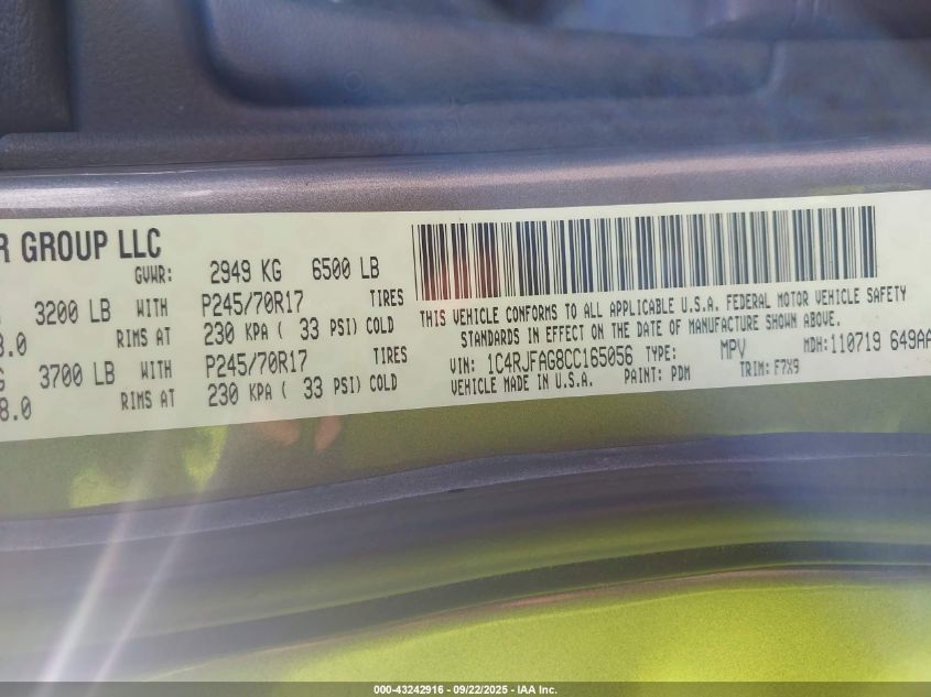 Колір СірийЦиліндри 6Привід Повний привідVIN 1C4RJFAG8CC165056Стан Заводиться та їде (перевірено)Ушкодження Передня праваДата аукціона 2025-12-17