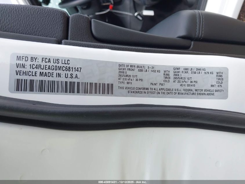 2021 JEEP GRAND CHEROKEE - 1C4RJEAG0MC681147, колір - Білий, 3.6, Бензин, із США