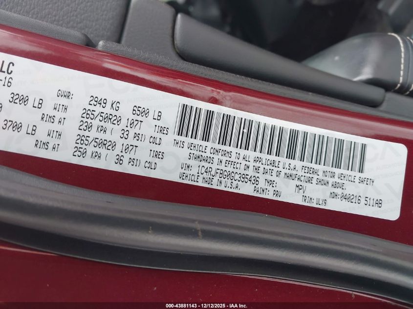 2016 JEEP GRAND CHEROKEE - 1C4RJFBG0GC395436, колір - Бургундія, 3.6, Бензин, Повний привід із США