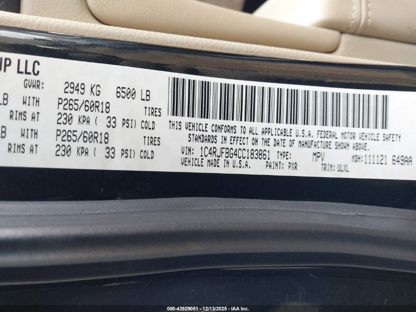 2012 JEEP GRAND CHEROKEE - 1C4RJFBG4CC183861, колір - Чорний, 3.6, Бензин, Повний привід із США