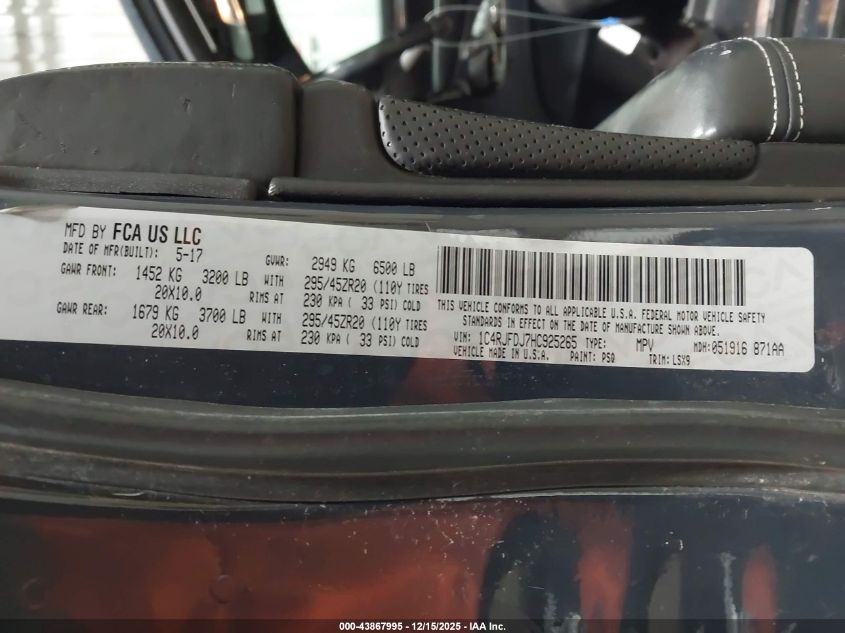 2017 JEEP GRAND CHEROKEE - 1C4RJFDJ7HC925265, колір - Сірий, 6.4, Бензин, Повний привід із США