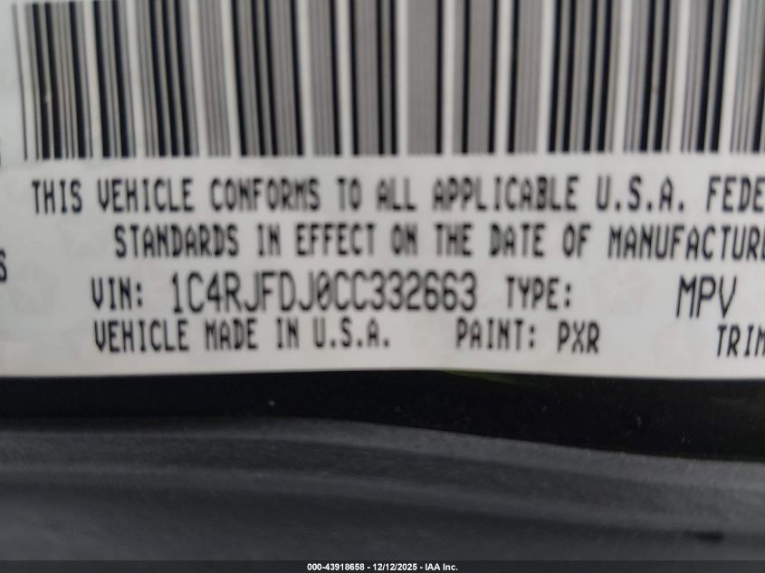 Колір ЧорнийЦиліндри 8Привід Повний привідVIN 1C4RJFDJ0CC332663Стан Заводиться та їде (перевірено)Ушкодження Ліва сторона