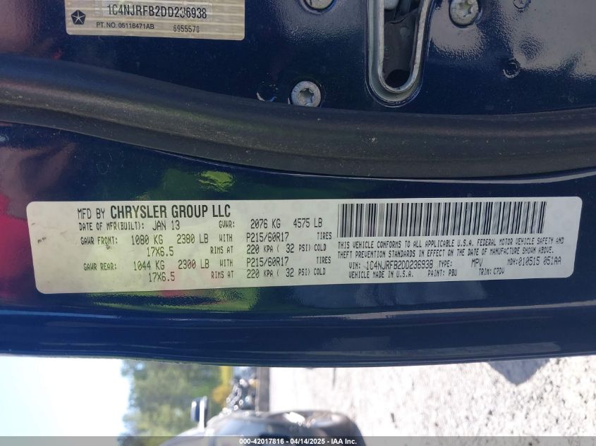 Колір СинійЦиліндри 4Привід Повний привідVIN 1C4NJRFB2DD236938Стан СтаціонарноУшкодження Передня або задня