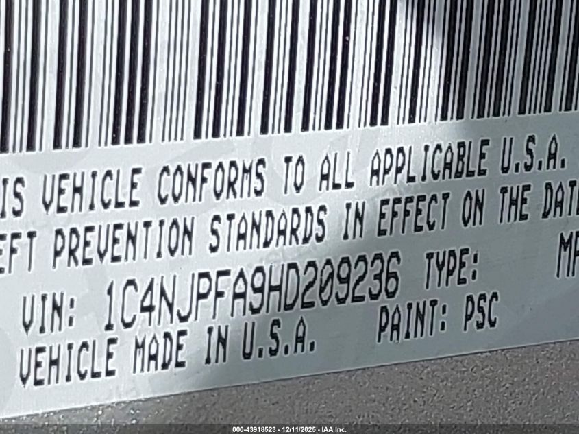 Колір СірийЦиліндри 4Привід Передній привідVIN 1C4NJPFA9HD209236Стан Заводиться та їде (перевірено)Ушкодження Права сторона