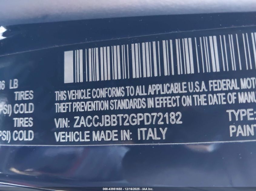 Колір Циліндри 4Привід Повний привідVIN ZACCJBBT2GPD72182Стан НевідомоУшкодження Передня права