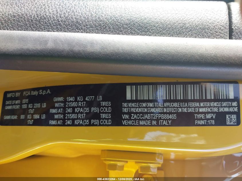 Колір ЖовтийЦиліндри 4Привід Передній привідVIN ZACCJABT2FPB88465Стан Заводиться та їде (перевірено)Ушкодження Передня або задня