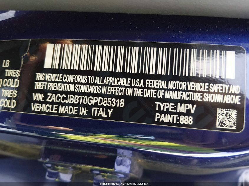 Колір СинійЦиліндри 4Привід Повний привідVIN ZACCJBBT0GPD85318Стан НевідомоУшкодження Невідомо