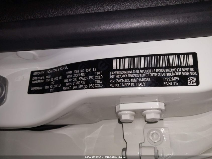 Колір Циліндри 4Привід Повний привідVIN ZACNJDD18MPM40364Стан НевідомоУшкодження Невідомо