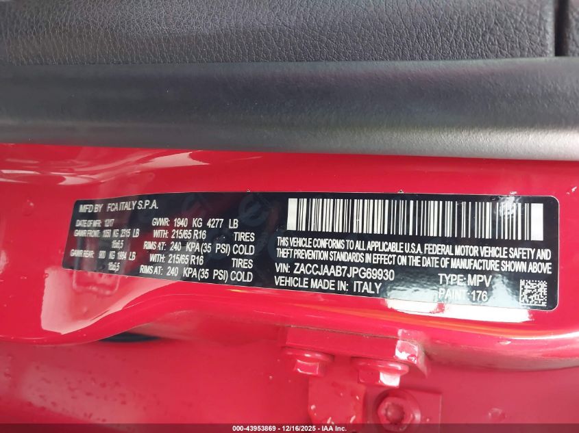 Колір Циліндри 4Привід Передній привідVIN ZACCJAAB7JPG69930Стан НевідомоУшкодження Передня ліва