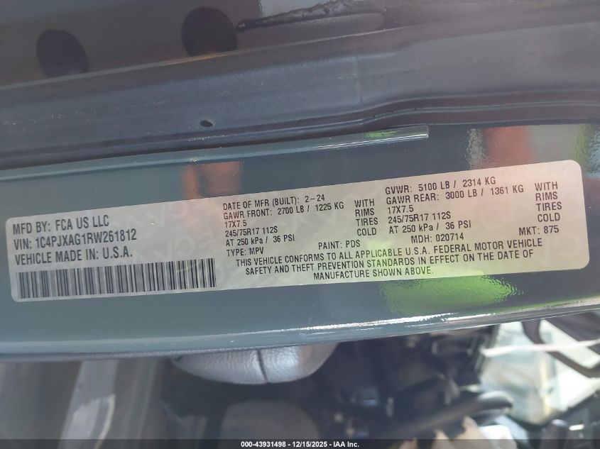 2024 JEEP WRANGLER - 1C4PJXAG1RW261812, колір - , 3.6, Бензин, Повний привід із США