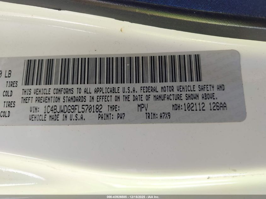 Колір БілийЦиліндри 6Привід Повний привідVIN 1C4BJWDG9FL570182Стан ЗаводитьсяУшкодження Перекидання
