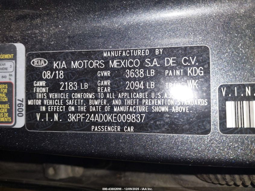 2019 KIA FORTE - 3KPF24AD0KE009837, колір - Сірий, 2.0, Бензин, Передній привід із США