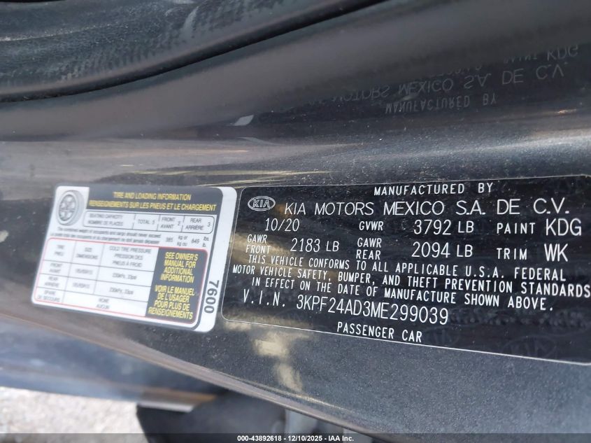2021 KIA FORTE - 3KPF24AD3ME299039, колір - Олов`яний, 2.0, Бензин, Передній привід із США
