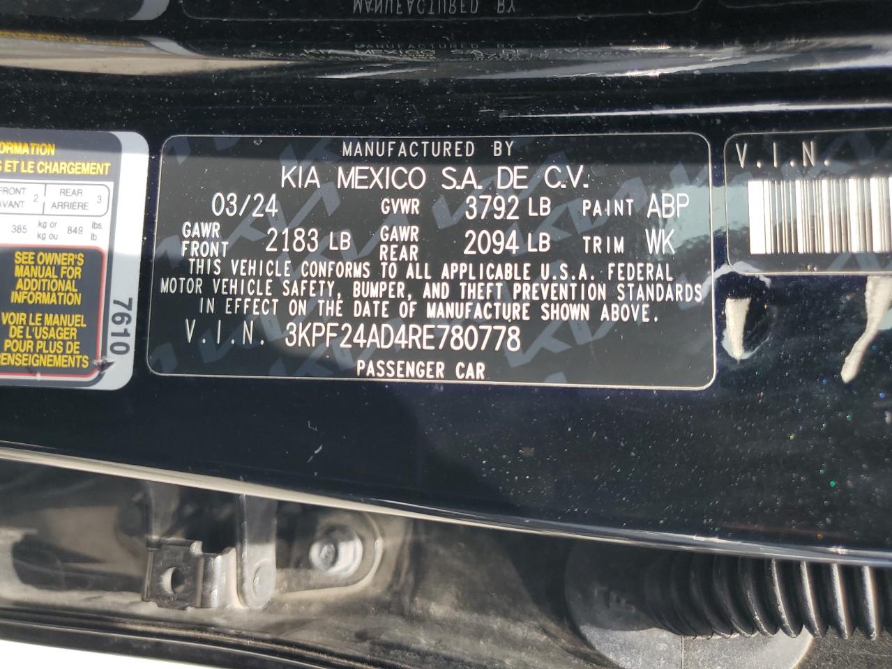 2024 KIA FORTE - 3KPF24AD4RE780778, колір - Чорний, 2.0, Бензин, із США